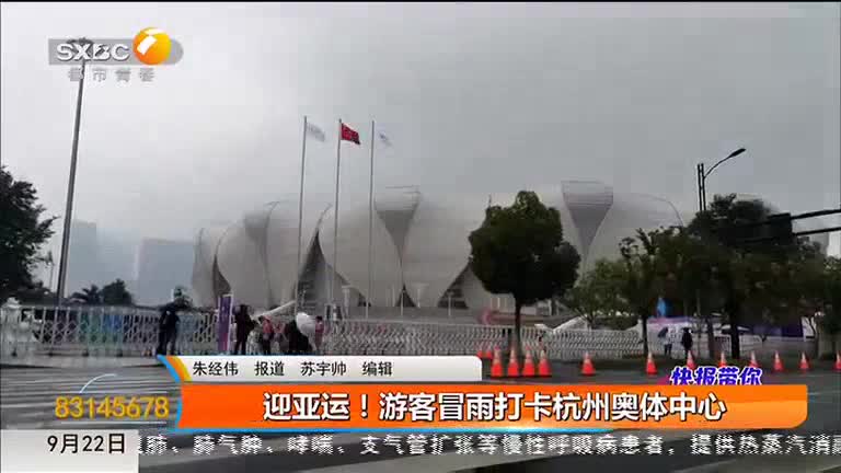 迎亚运!游客冒雨打卡杭州奥体中心